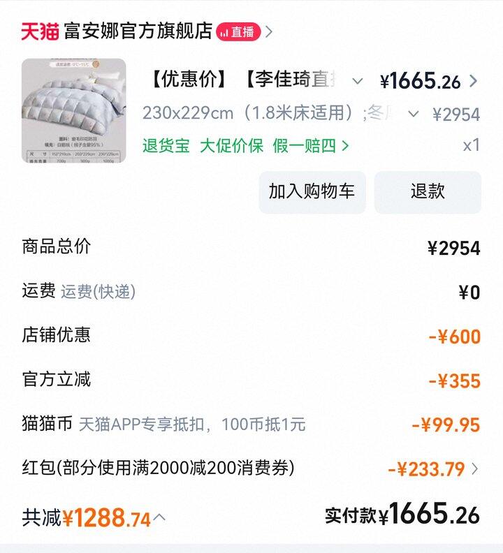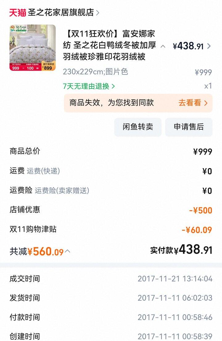 但搜了一下自己的订单,发现富安娜的羽绒被还挺可以的,17年双十一才400多,尺寸套1.8m常规被套完全OK,虽然面料是聚酯纤维但是不会滑跑。