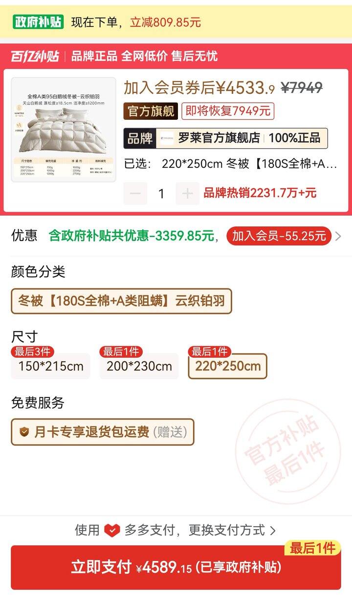 如果面料都是聚酯纤维,罗莱线下3300,感觉和线上平台差不多。聚酯纤维面料好的地方就是很轻很轻,盖上不压身。但缺点就是容易和被套不服帖,滑跑或者起静电。线上买了富安娜,客服给的链接,面料就是聚酯纤维,清洁度和罗莱一样的,蓬松度差一点,充绒量1000g。比罗莱少200g,且尺寸比较奇葩。