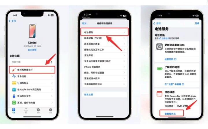 预约流程:手机下载“苹果支持” App —— 预约附近的直营店 —— 选择“维修和物理损坏” —— 选择“电池服务”。