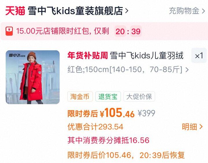 ❹ 返回🛒,2款分别拍1件,雪中飞儿童羽绒服 目前限时天降15块红🧧,到手105.5,尺码110-170cm