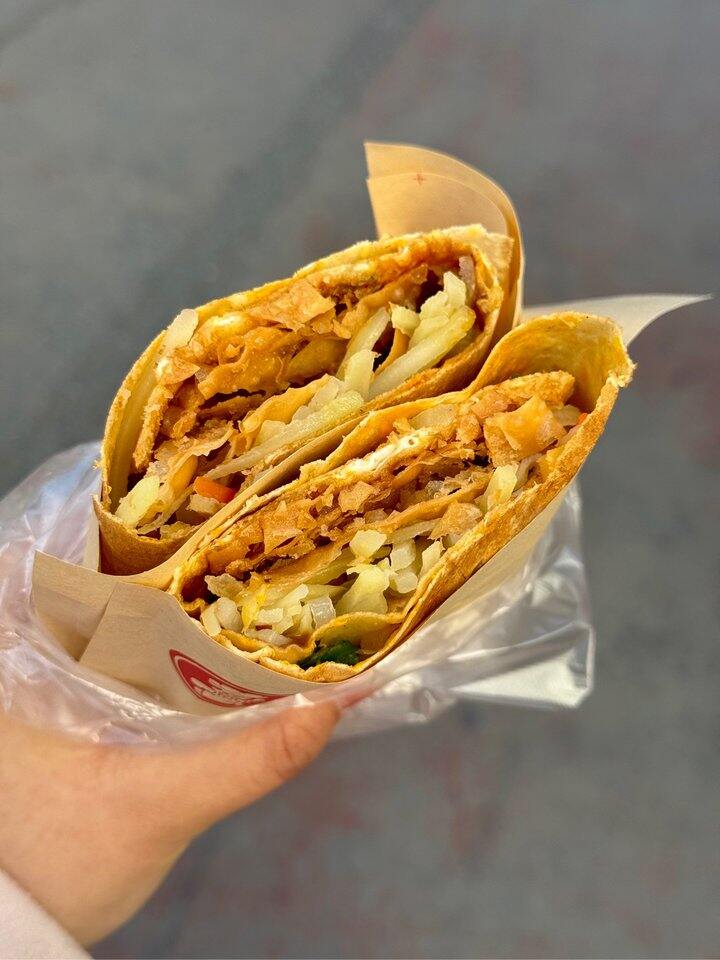 煎饼果子我最爱的就是加土豆丝🥰我吃一半 老崔吃一半