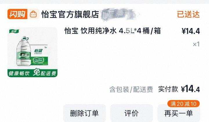 ②日常爆红包-13叠加大牌神券20-10,怡宝4桶4.5L的水到手14.4,别忘记在淘金币下单再减0.5。