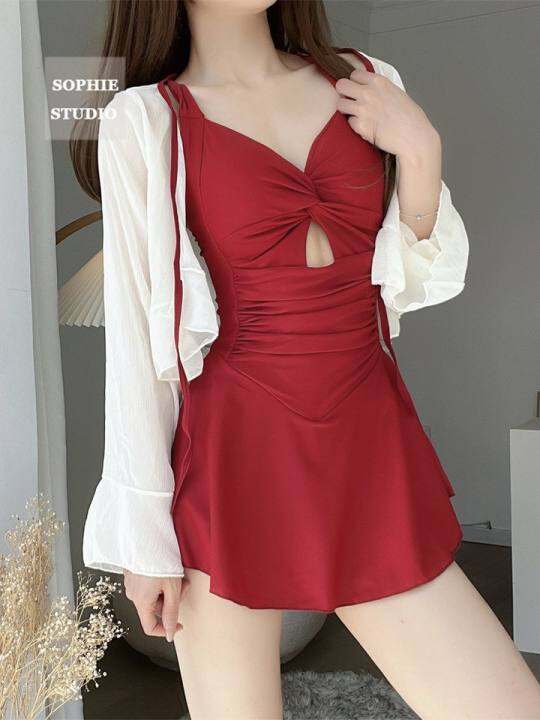 SOPHIE原创显白浆果红连体裙式小胸聚拢运动保守遮肚温泉度假泳衣