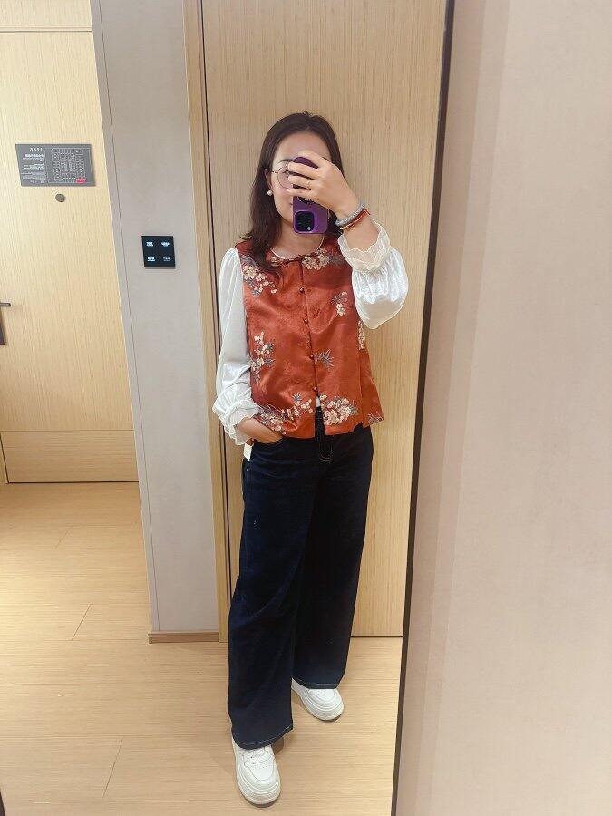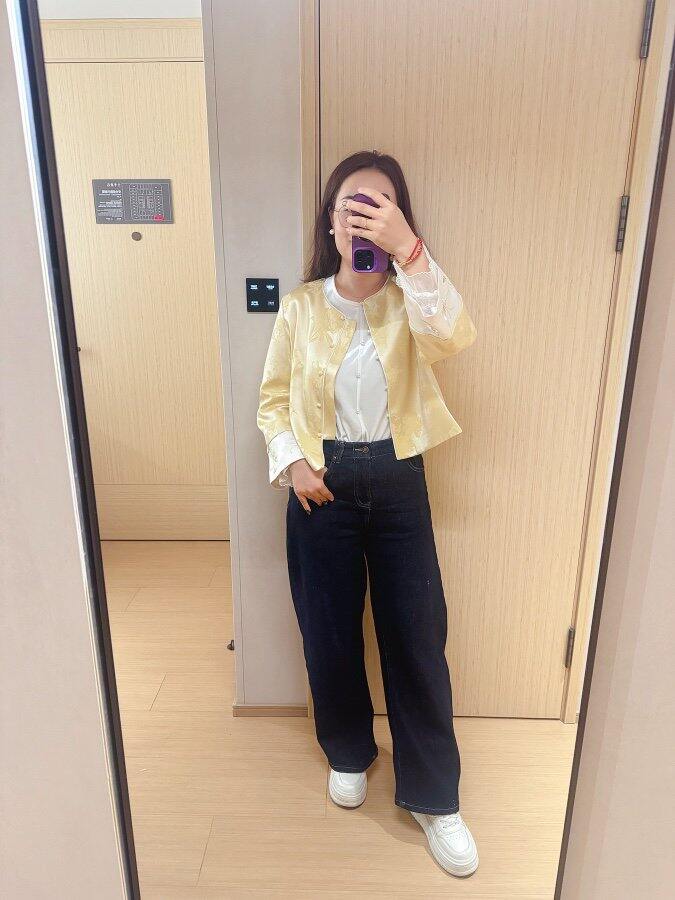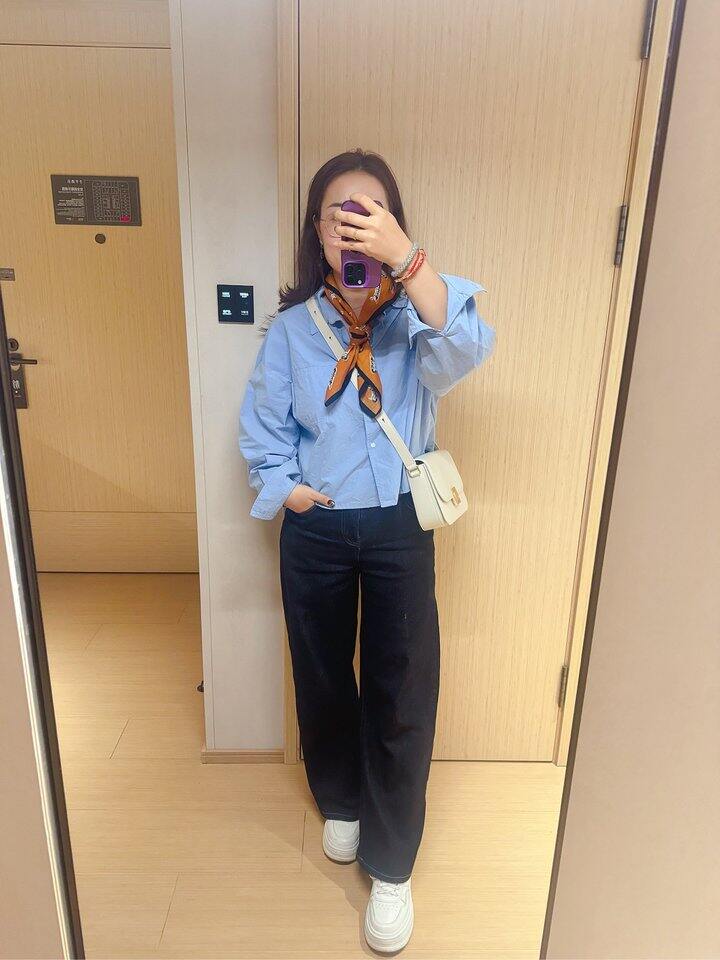 这是我挚爱的牛仔外套,穿这个裙子也很搭,黄丝巾提亮,白打底也是提亮,感觉这身搭配适合老师,真不错。