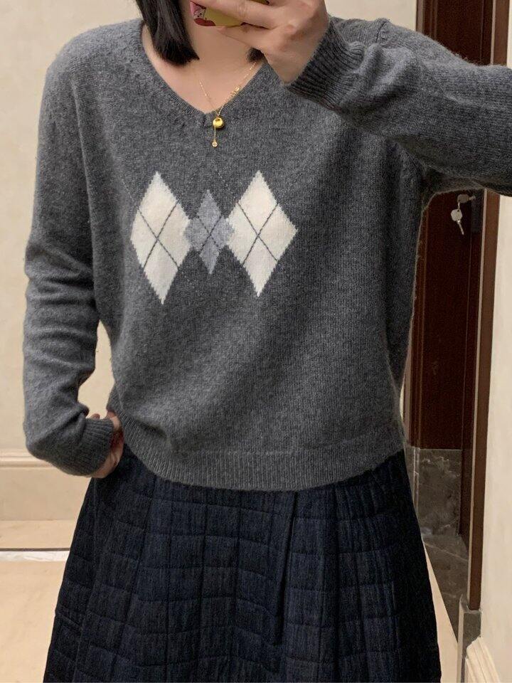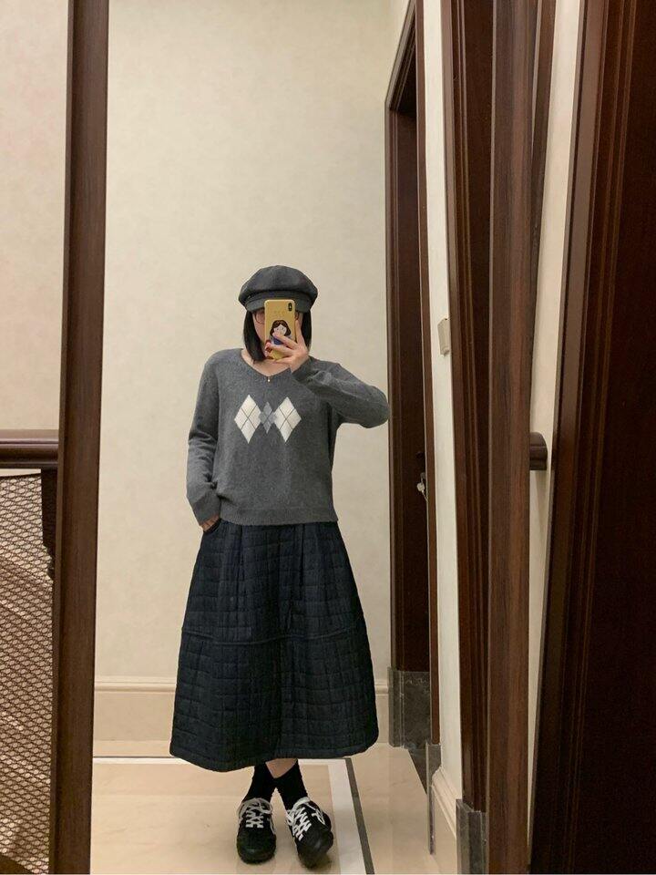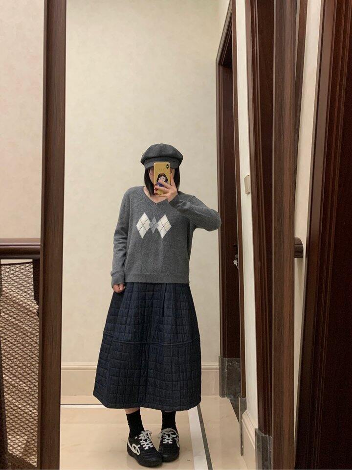 灰色菱格薄毛衣我本来还有点担心会小 但是又很喜欢这种简单基础的款 所以还是入了 上身还不错耶 也适合暖和一点穿 单穿会有点扎 最好里面穿个背心啥的
