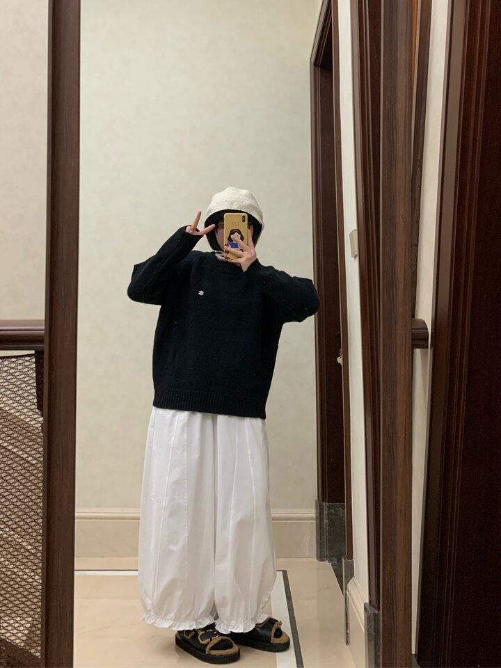 黑毛衣白裤子店里模特穿了一整套 但是我觉得材质不适合搭在一起 因为裤子太薄了 只适合春秋 毛衣是有点厚度的)但是分开两个单品都蛮好看的 也很百搭 比较基础