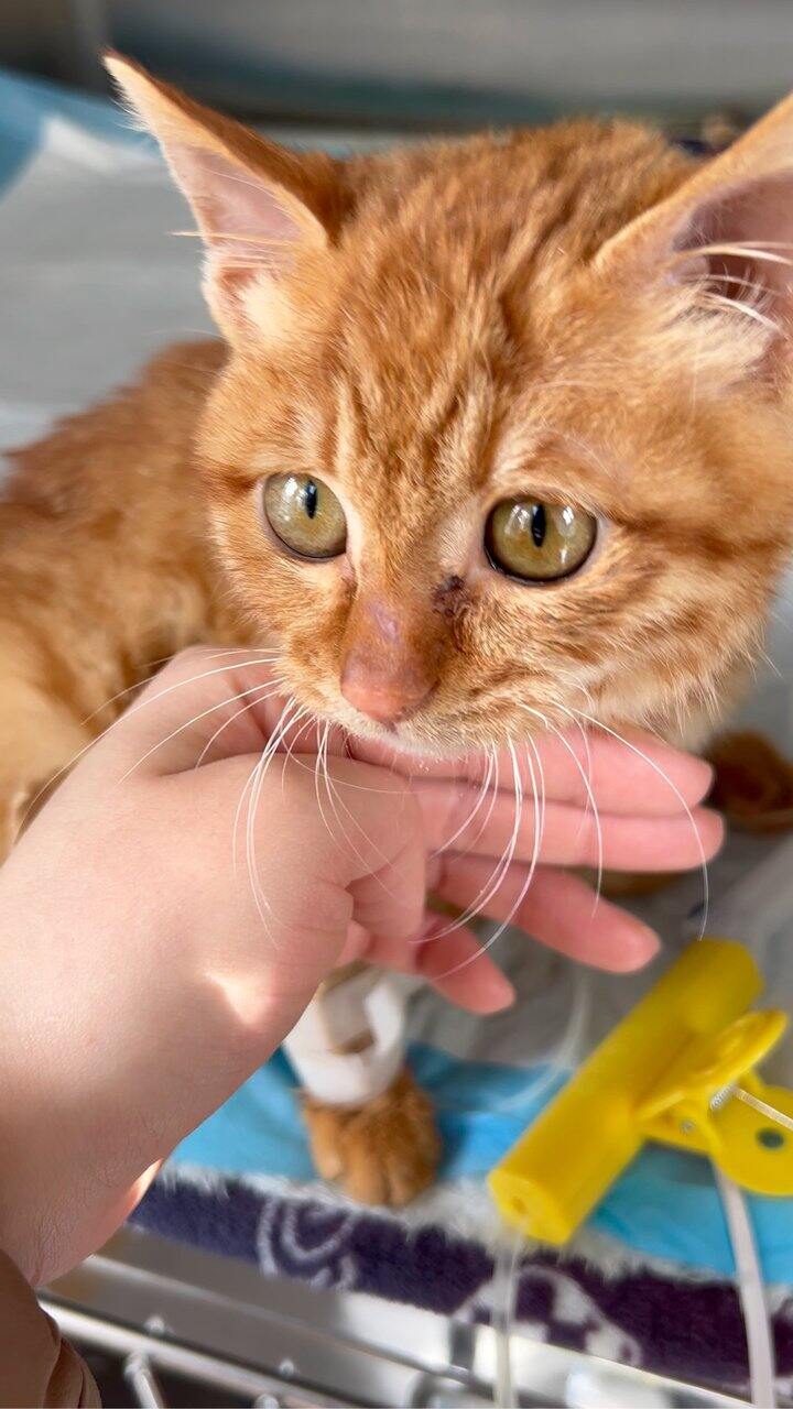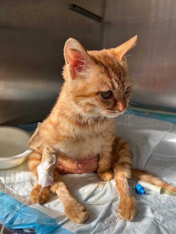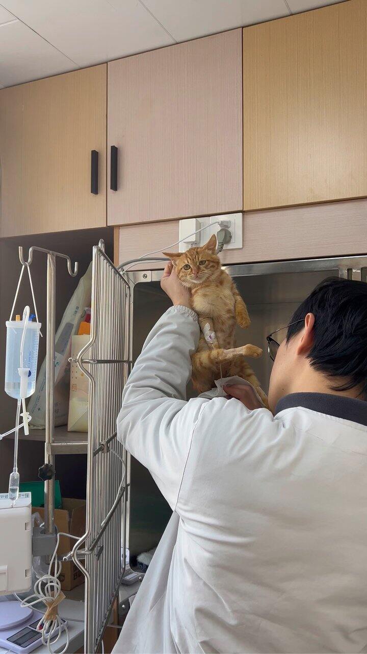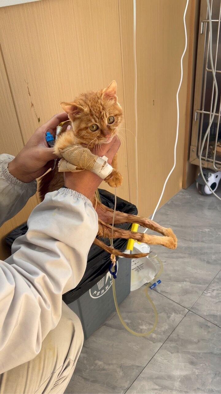 太可怜了,2025年底寄养大姐说小家伙呕吐抽搐,我们送去医院发现是膀胱破裂了,尿液流到腹腔,非常危险,给花花做了手术,发现膀胱颈一部分组织被尿液腐蚀了,用了其他部分组织缝合了膀胱,用了导尿管。