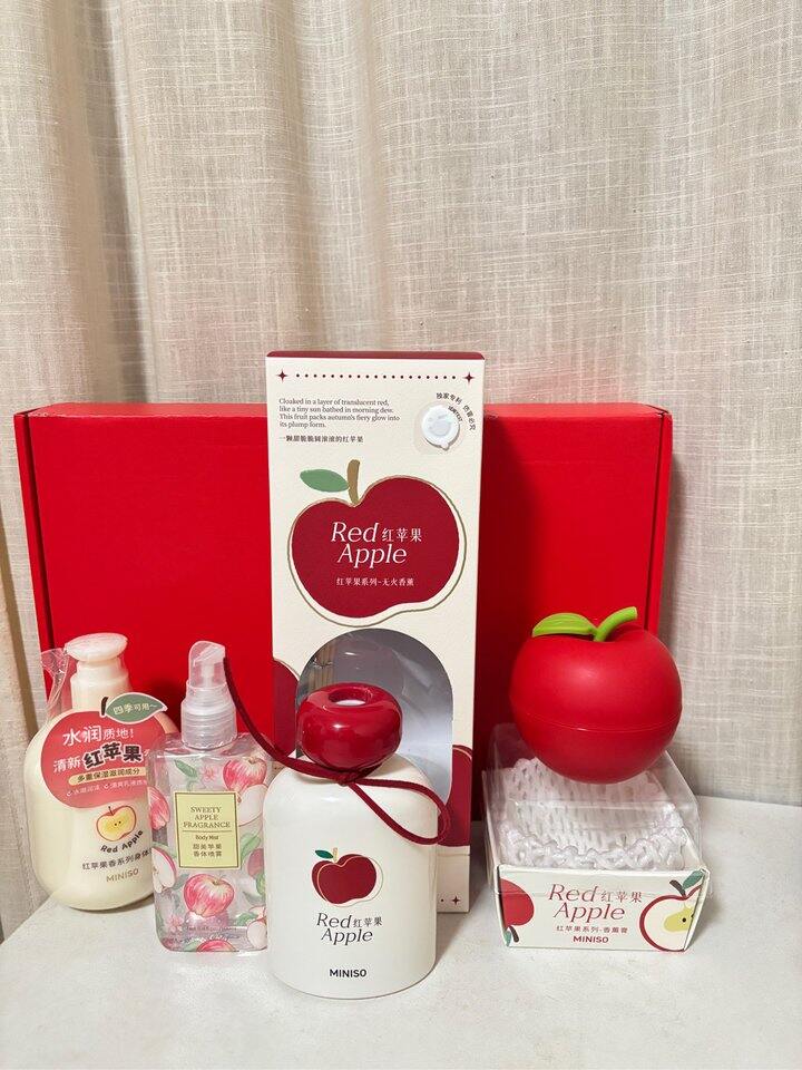 前两天美团名创优品99-40买了一单红苹果系列,首先最好评的是这个香膏,打开放在卫生间香味可以飘很远,就是那种酸酸甜甜的新鲜苹果气味,喜欢之[花心]无火香薰我还没打开用,不过瓶子好看;身体乳也是苹果味但是留香太短啦,优点是不会很黏腻;喷雾香精味比较浓,同样留香短。同系列还有蜡烛香薰,但是我觉得我会懒得用就没买,不过造型做得很好看。