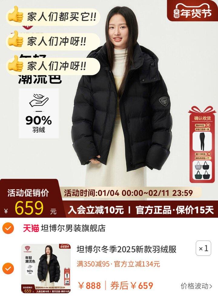 1、坦博尔冬季2025新款羽绒服女短款泡芙量感保暖外套加厚面包服时尚https://m.tb.cn/h.7PIbxR2弹131礼金,淘金币页面加购