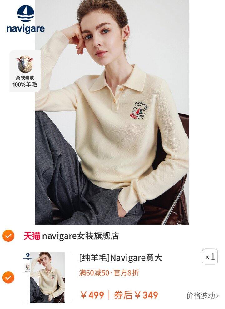 1、[纯羊毛]意大利小帆船针织打底衫女士秋季新款翻领毛衣https://m.tb.cn/h.7k6SSkx弹69.8礼金,淘金币页面加购