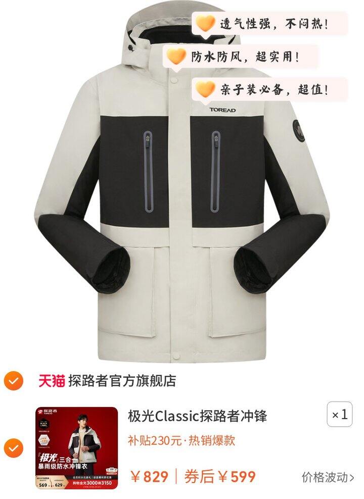 1、极光Classic探路者冲锋衣男专业户外三合一防风登山冬季外套女https://m.tb.cn/h.7PgDuxh弹107礼金