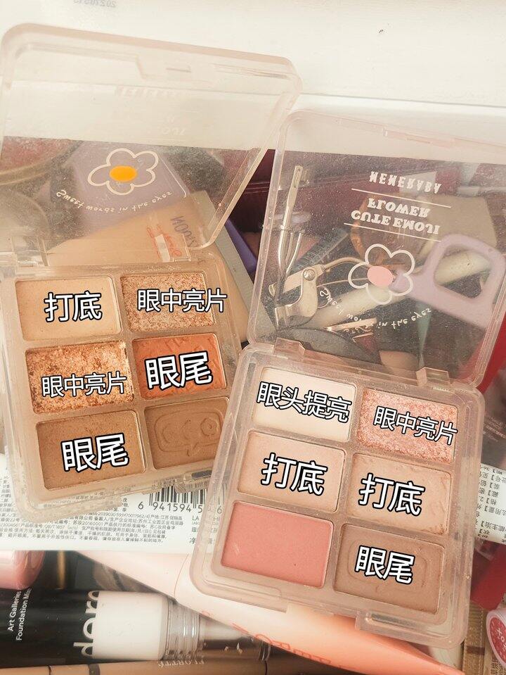 家里便宜的贵的都有,加起来得有近十盘,这两盘是使用频率最高的,推荐all in,只要10块钱。粉质我觉得还挺细的,但是高光亮片蛮粗糙的。会飞粉,属于正常现象,贵的TF也飞粉[胖鹿笑哭]