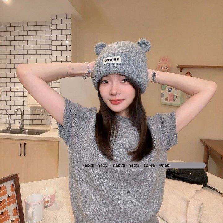 娜比】小熊耳朵帽子可爱贴布针织毛线帽男女秋冬季新款保暖冷帽