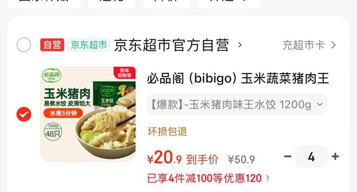 💰8.7/斤 必品阁 招牌系列玉米猪肉味王水饺 1200g/袋