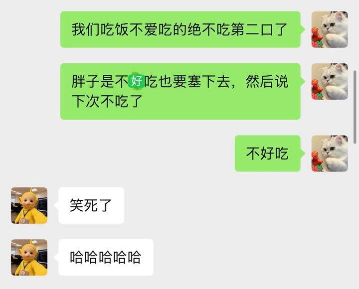 和姐姐吃饭,我吃这个菜不好吃就不会再吃第二口,她就硬要吃了,理由是:不难吃。