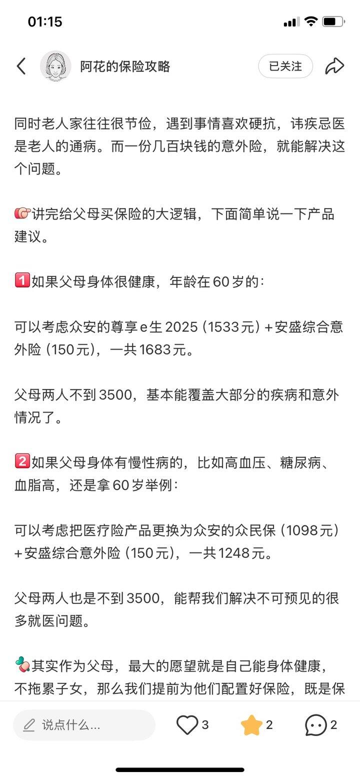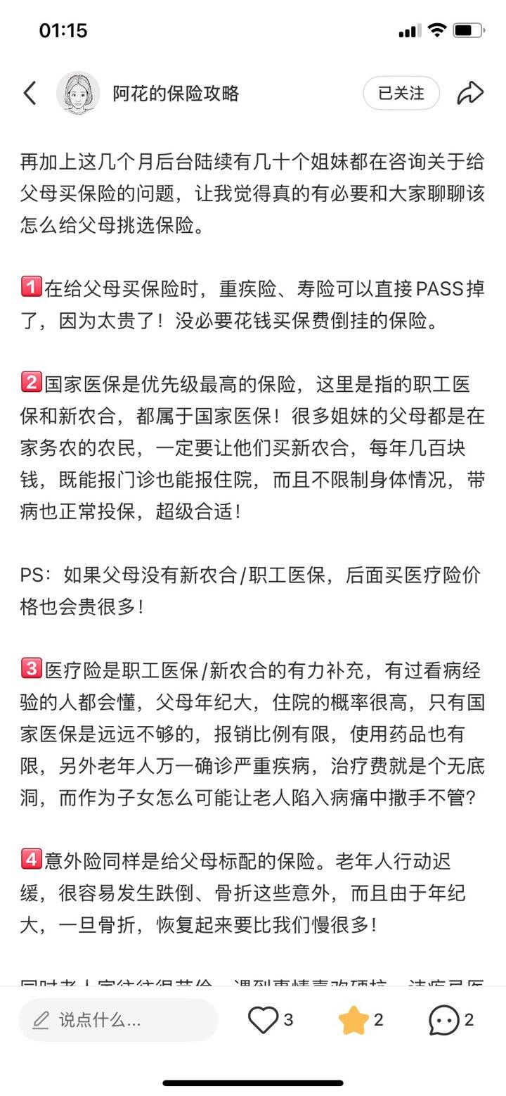 先回去套爸妈的话,问有哪些住院记录。偷偷买,不和爸妈说,买了再说。不然他俩又心疼钱,不让我买。这是大部分父母的做法。但是从我的角度来看,我和我妹妹得做好爸妈养老规划,不然我爸妈即使有养老的意识,他俩怕给我和我妹妹添加负担,不会舍得为自己打算,看病消费都不舍得,那怎么行?要是万一生大病,我和我妹妹把自己卖了都有可能搞不起医药费,直接一穷二白了。