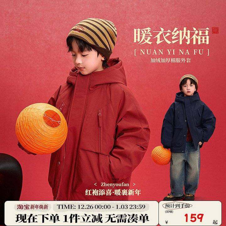 祯有范童装男童红色冲锋外套夹棉冬装2025新款儿童摇粒绒拜年棉服