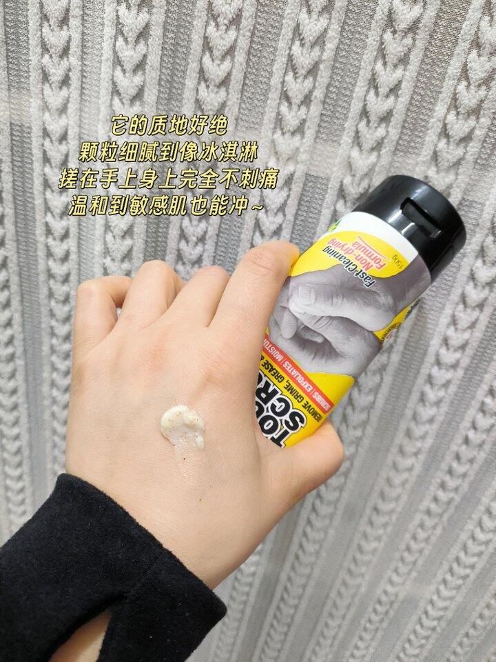 它的质地好绝,颗粒细腻到像冰淇淋,搓在手上身上完全不刺痛,温和到敏感肌也能冲~