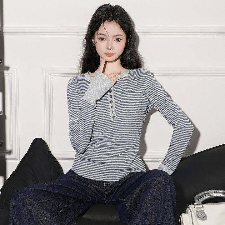 撞色条纹设计感半开领长袖T恤女2026春秋新款甜辣妹打底上衣