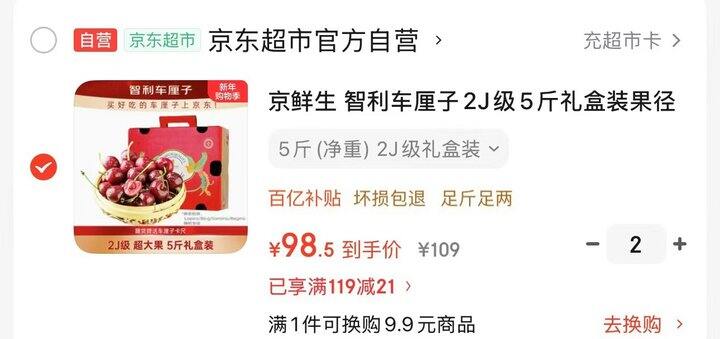 ‼️京鲜生2J级车厘子5斤礼盒
