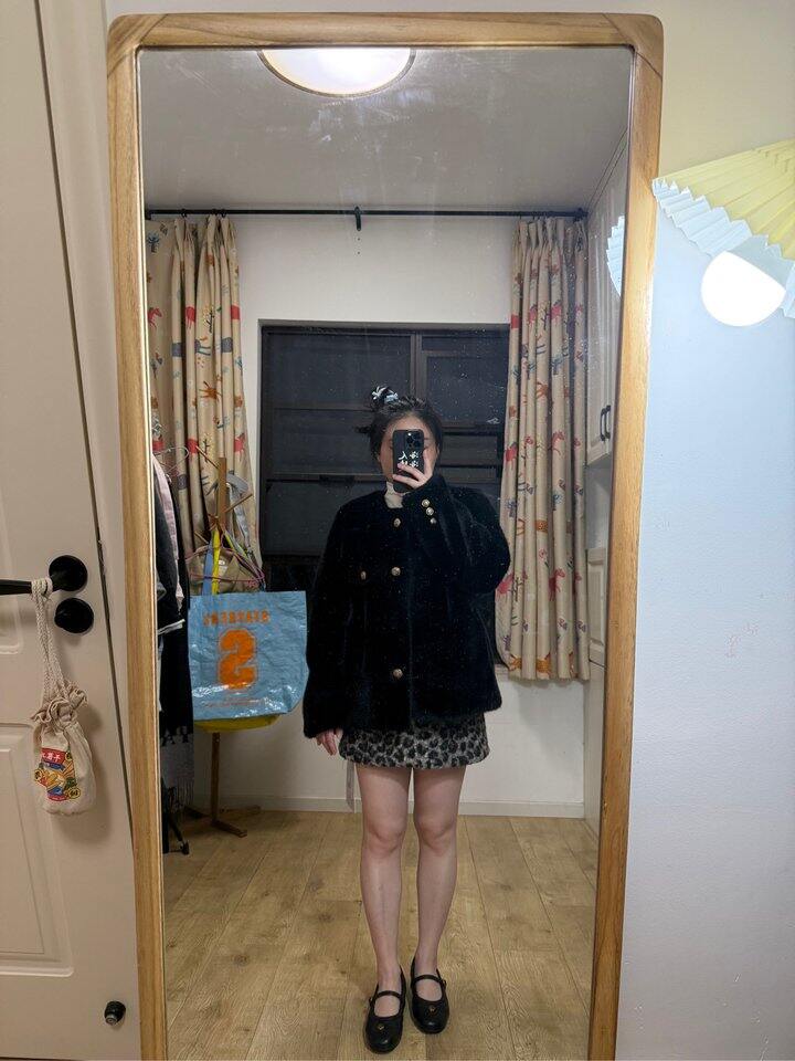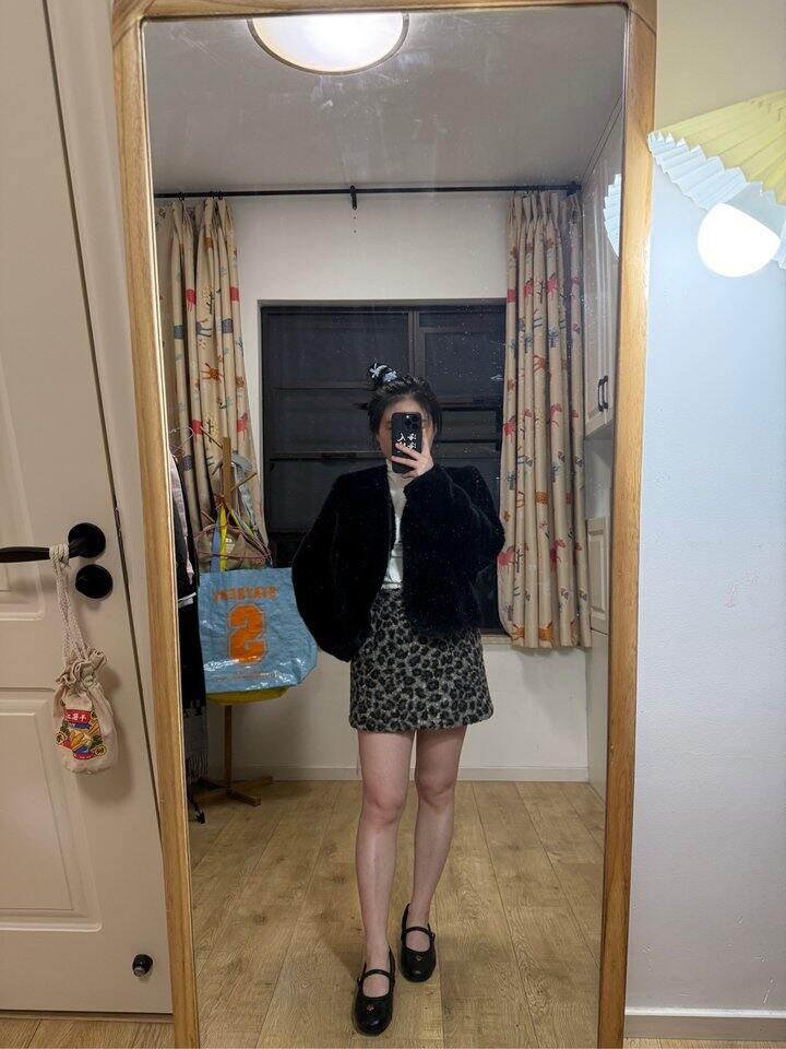 还买了条豹纹裤,不是棕色的,是灰色的。裤头拉链很难拉上去,但是搭配还行吧