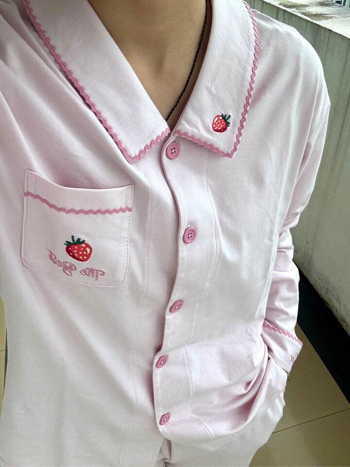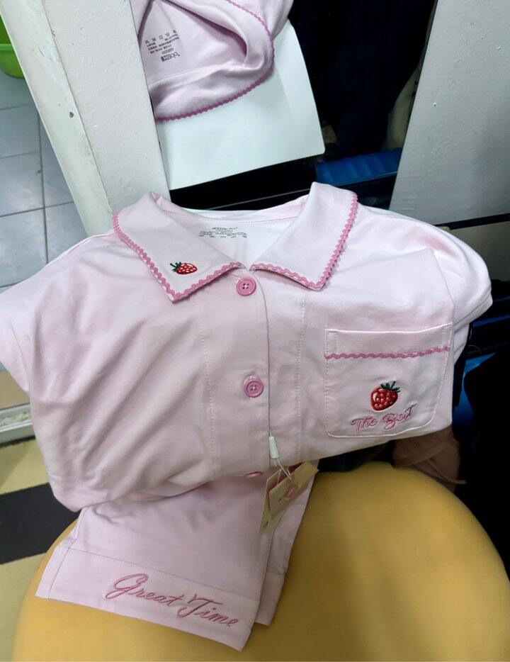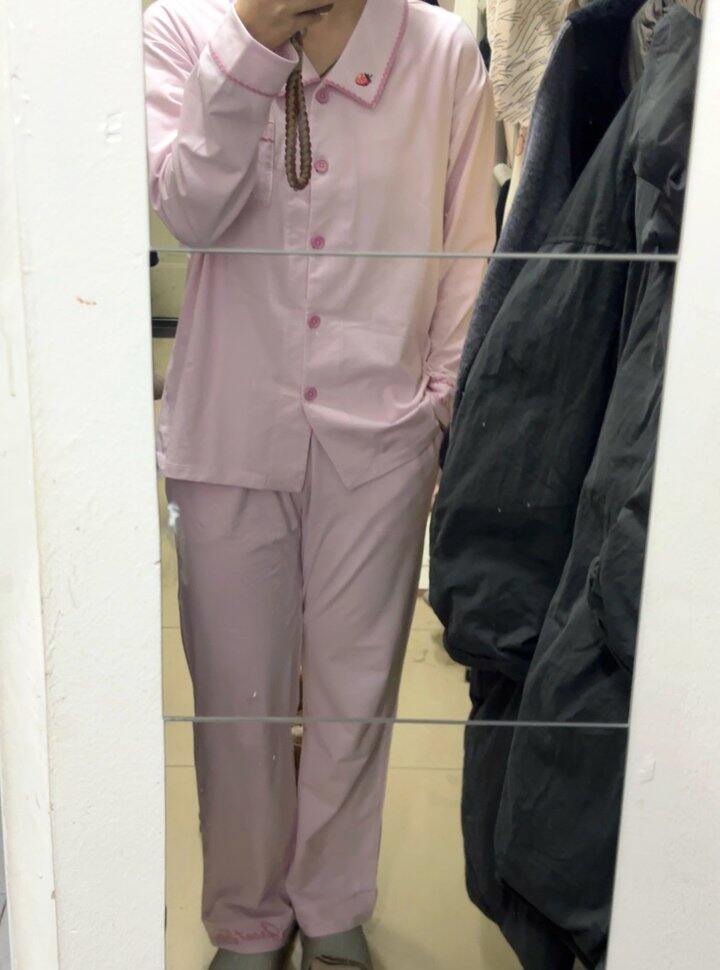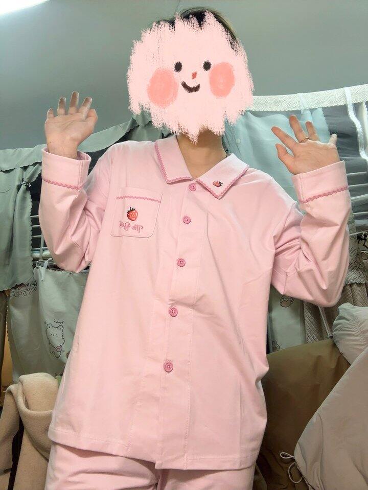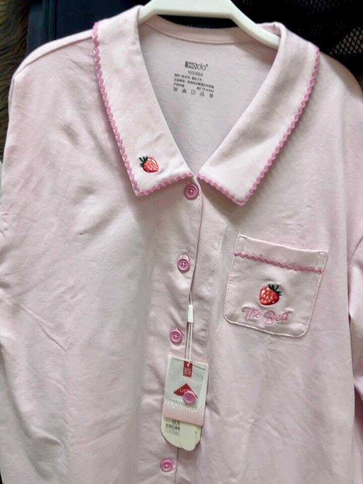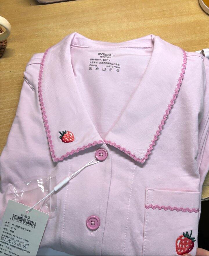的福利。本人身高体重164 114,供参考。 入手了红豆家这套睡衣,粉色的睡衣面料舒服,正好现在这个季节穿。粉色超温柔,像把春日暖阳穿在身上。面料软乎乎,贴肤超舒服。开春穿正好。收到衣服基本没有一根线头,质量做工蛮不错的。精致的包边和可爱[草莓]刺绣,细节满满。