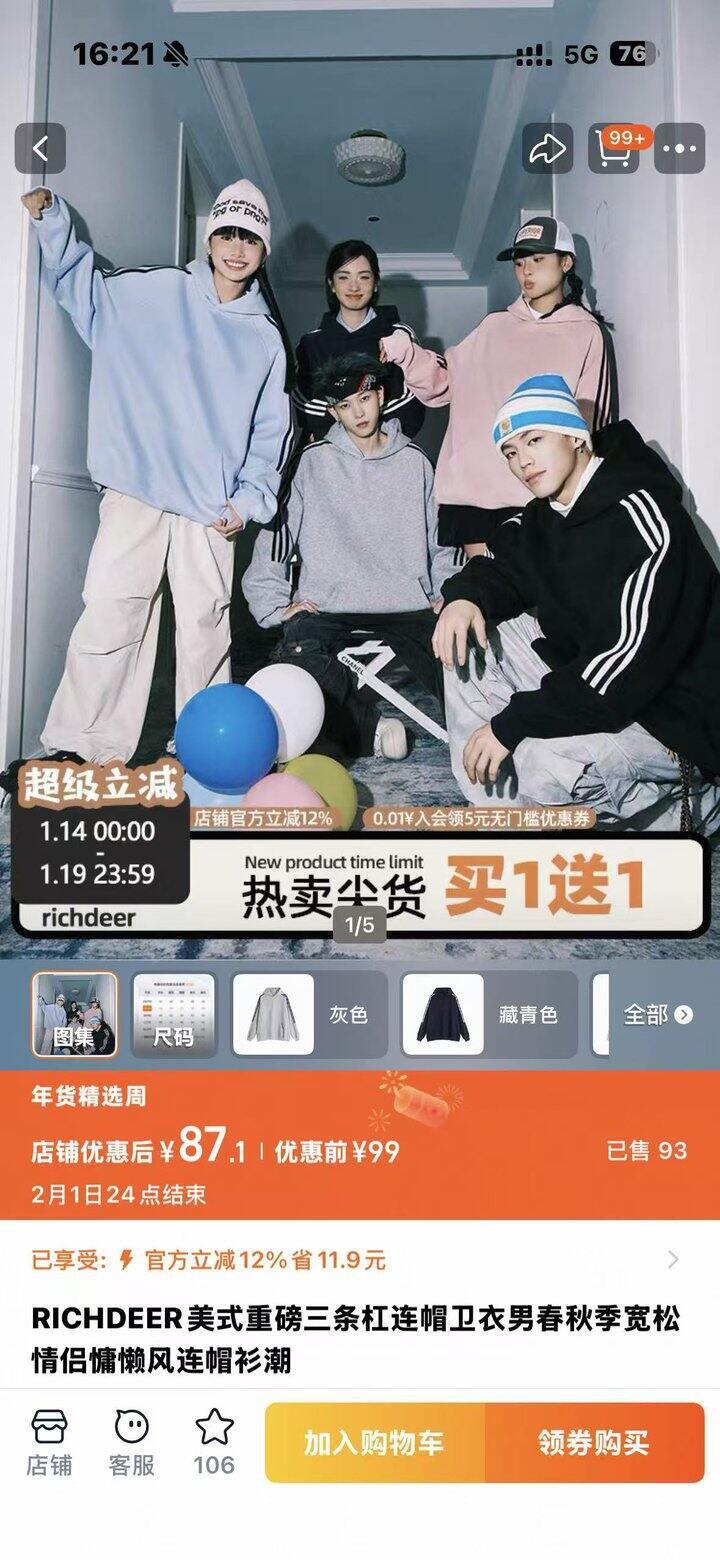 5RICHDEEr买一送一,适合买秋冬穿的高克重厚卫衣,他家走的是美式潮牌风格我买过一次卫衣的克重量很高他们家卫衣买满还是挺划算的这个价格。