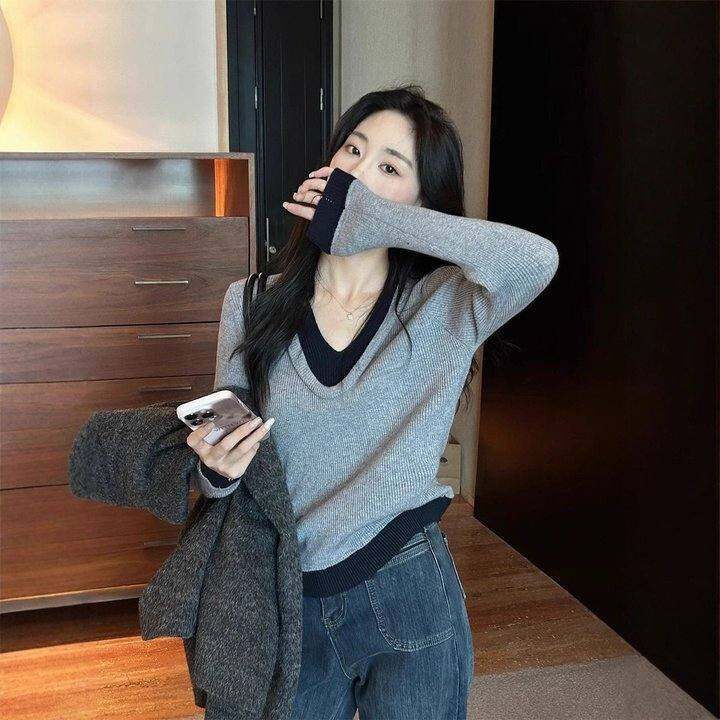 假两件!!秋冬V领假两件软糯长袖针织衫女修身内搭打底上衣