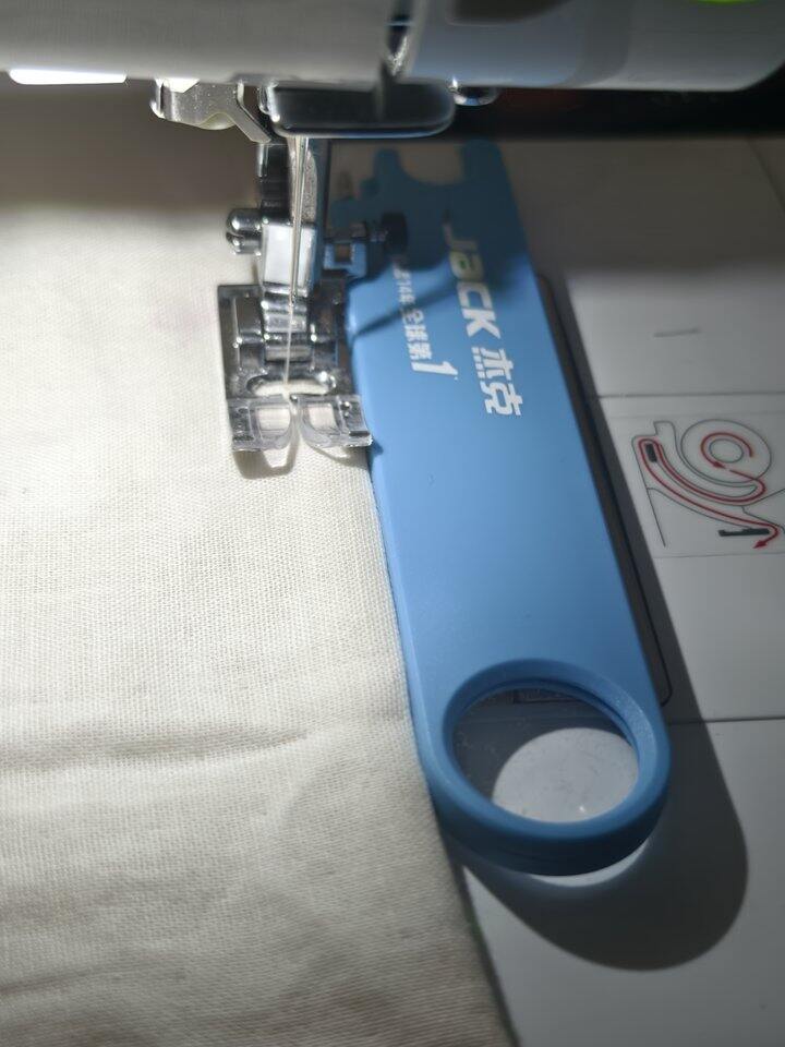 顺便安利一下这个蓝色的杰克多功能穿线器,不过我不是拿它来穿线,而是作为定规使用。它背面有磁铁,靠在压脚边上,就能轻松缝出笔直的线。它比普通的定规更长,感觉更方便。