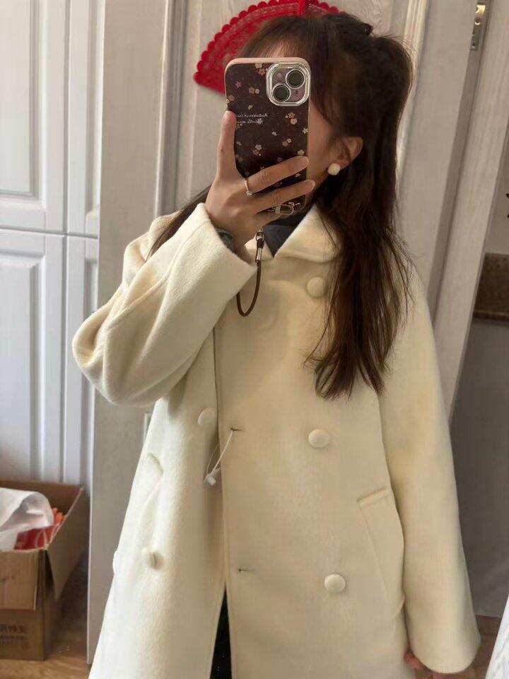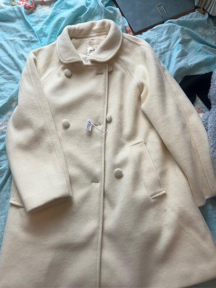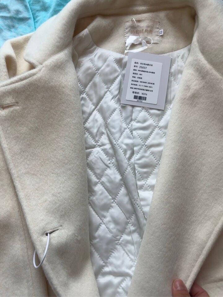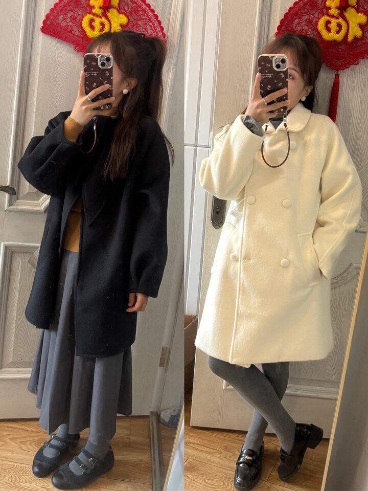 韩系风格:白色这件衣长81厘米,里衬夹棉,插肩袖,a字版型,搭配灰色打底裤,再自己搭配一个短裙,黑色小皮鞋,或是复古蓝微喇叭裤子!