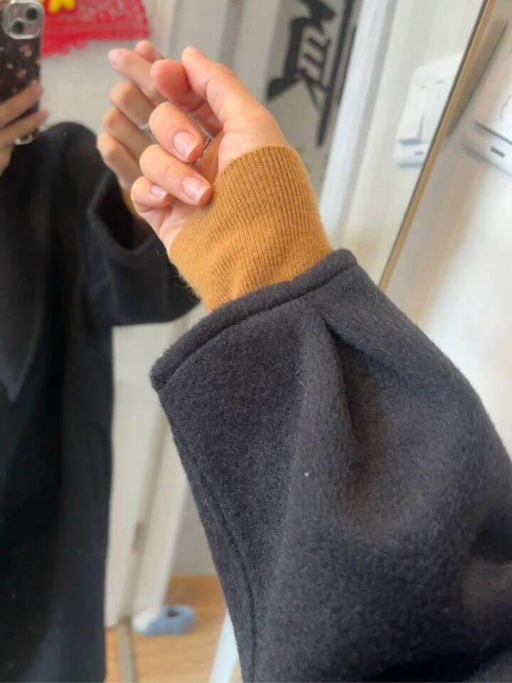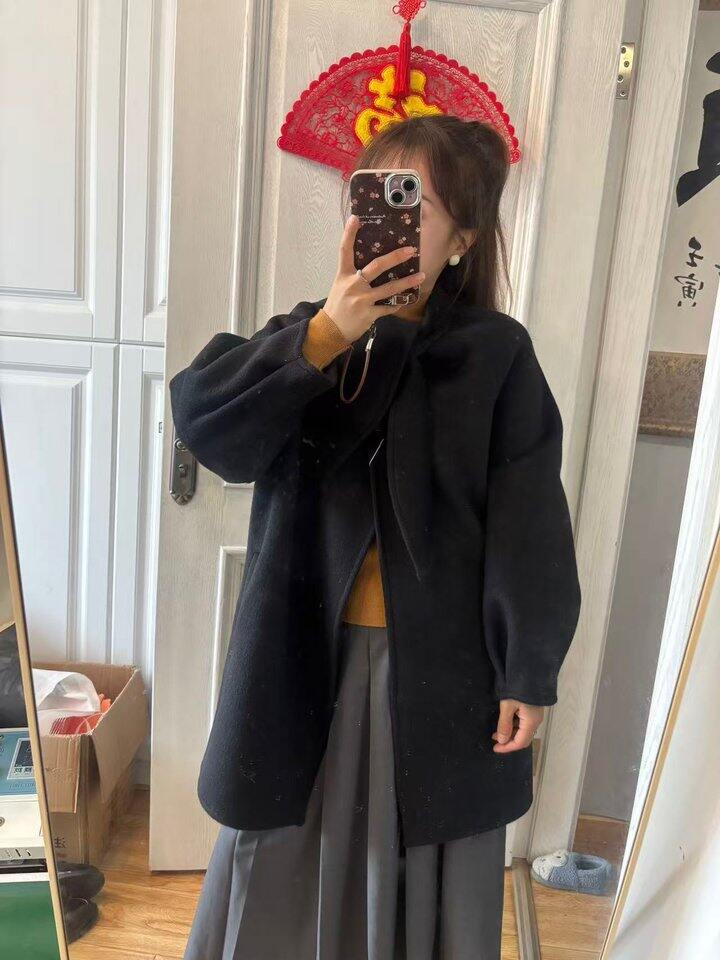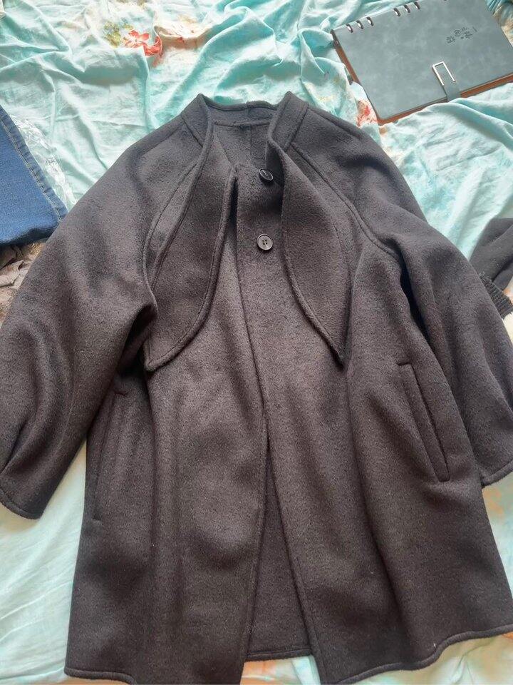 另外一件是纯黑色的,拍出来有点发灰,双面毛呢,这件衣长77领子是两个兔耳朵,扣子只有两个,下摆是岔开的,袖子是九分袖的