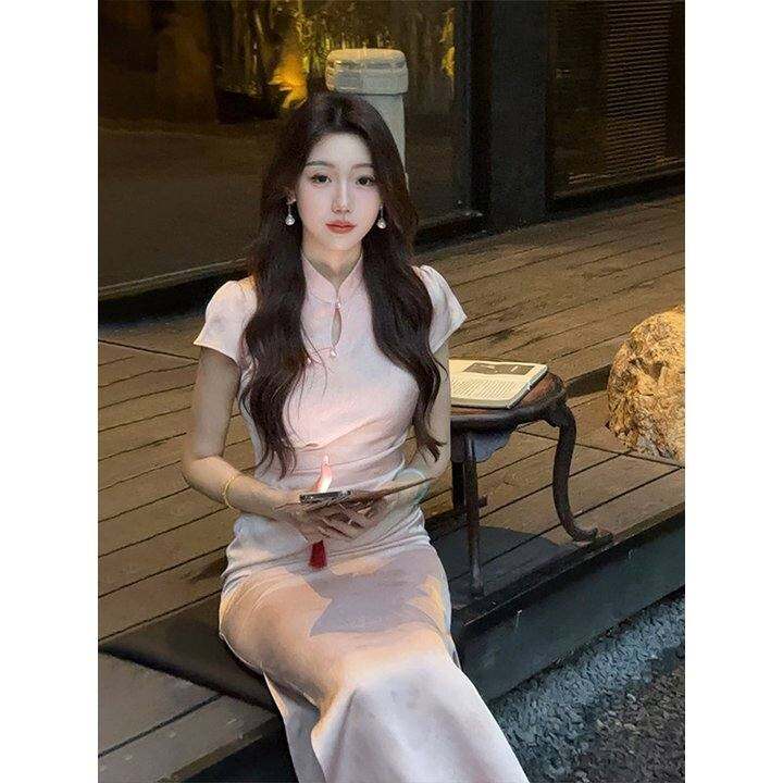 凌茜恣禾 清光'粉色新中式缎面洋装女夏小个子蝴蝶印花改良旗袍