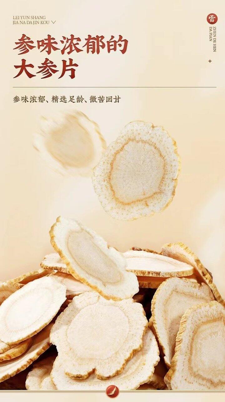 ✅甄选软支,主根切片,呈放射状纹理 ✅参片大小均匀,可达3倍泡发率 ✅肉身老,参味足,人参皂苷丰富 ✅肉质紧实耐冲泡,参味浓厚,微苦回甘