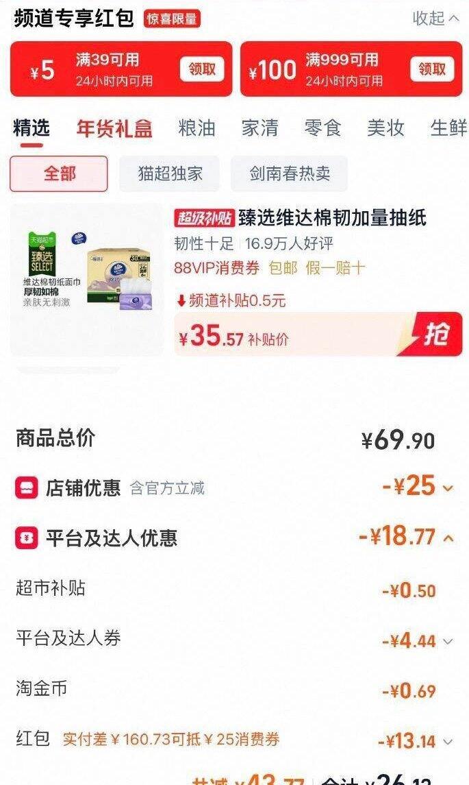 ②猫超首页进入超级补贴领39-5红包 加购1件