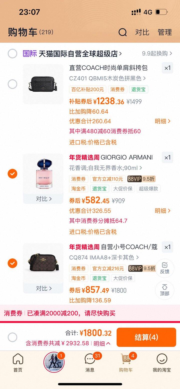 88vip 领消费券凑2000-200,淘金币页面下单凑。然后充值购物金3000得3150,凑下来700多。链接发不出,在我截图里选吧。而且这个包包页面还送迪士尼挂件。