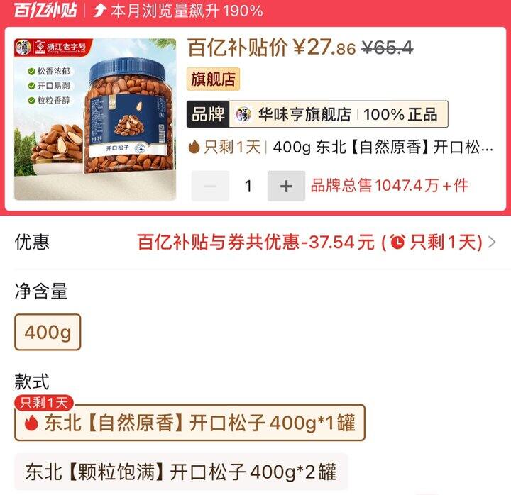 [华味亨]开口松子400g罐装