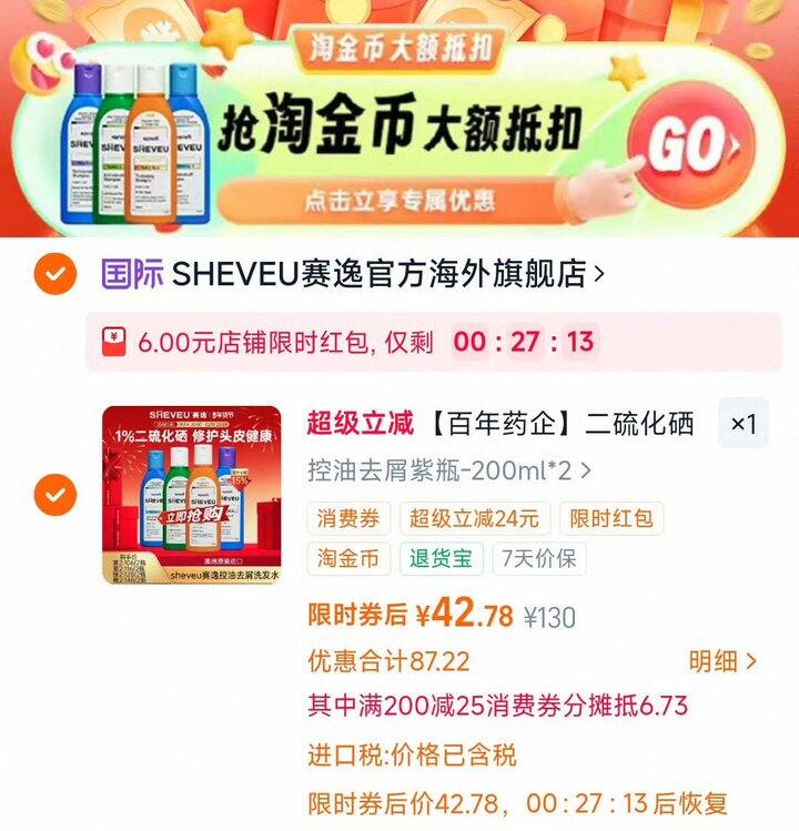 下拉详情,下1件,SHEVEU赛逸二硫化硒去屑控油洗发水200ml*2瓶