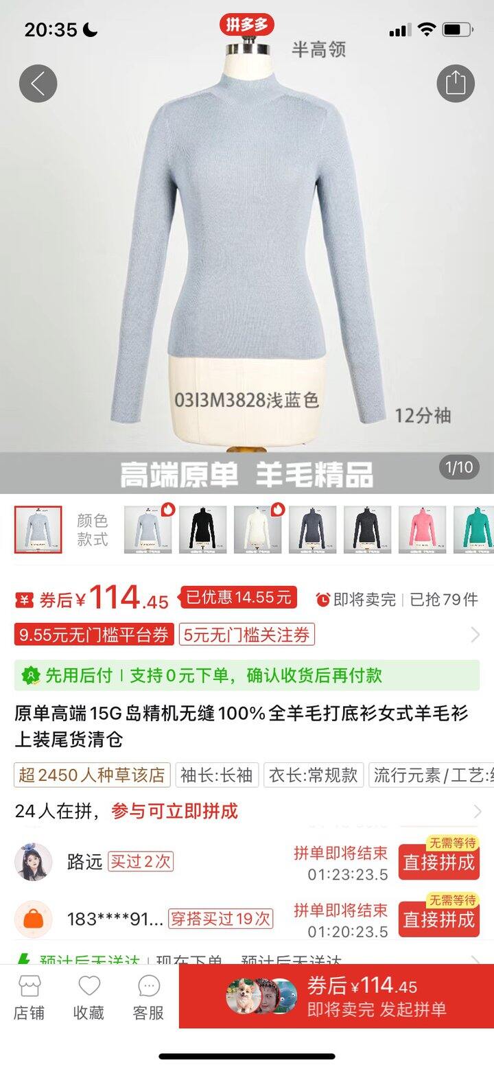 岛精毛衣,昨晚80,尺码颜色挺全,今天大码没得很快,看图质量不错。https://p.pinduoduo.com/IbswKtxk?sc=EFAC