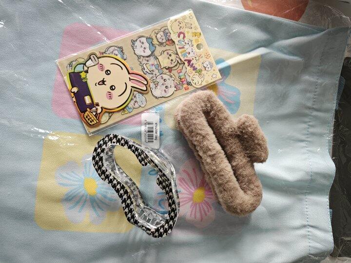 十块钱的帆布袋,颜色清新,适合春天!两个抓夹,还让试,我说我头发太厚怕夹不起来,卖货的小妹妹帮我挑了两个,嗯,不错,一个五块钱。还有一个面碗,十块钱。米色托特包很轻容量很大,还可以挂行李箱上,35块钱。最后我问贴纸多少钱,小妹妹说送我了,快乐!!