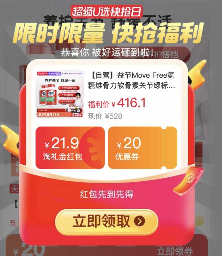 淘宝领🧧: https://s.click.taobao.com/A4v8Q8o 益节Move Free氨糖维骨力软骨素关节绿标氨糖120*2:https://s.click.taobao.com/UxDGj9o,领21.9淘礼金红包;
