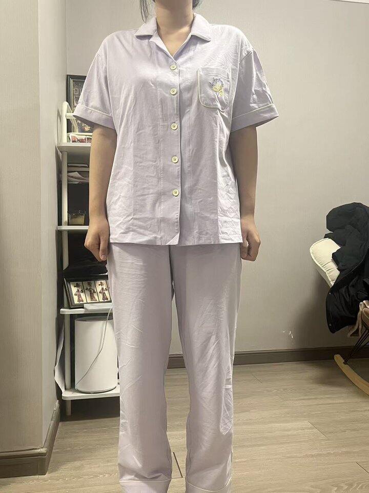颜色是淡淡的紫色,穿起来不挑人,很显白。睡衣柔软舒适,很亲肤,穿起来没有束缚感。睡衣做工精细,包边细节处理得很好。短袖➕长裤的组合,可穿性很高,一年四季都能穿。