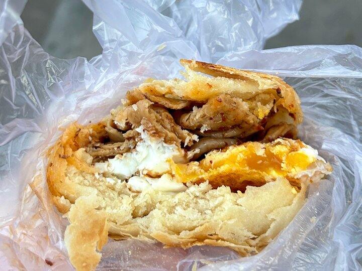 大饼夹卷圈,卷圈很有特色,竟然是腐乳调味的豆芽