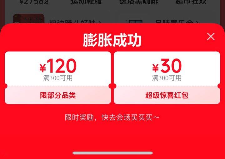 大部分作业基本上都要用到这张,领完200-20后点膨胀,这里会膨胀出300-30,500-50,800-80等超级惊喜红包还有300-120、699-100、1000-100等品类好券