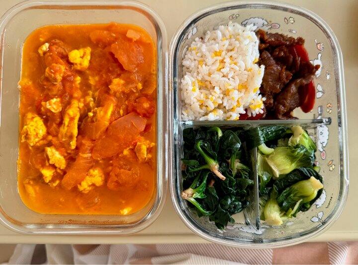住院第一天我妈送的饭菜牛肉有一丢丢的咸