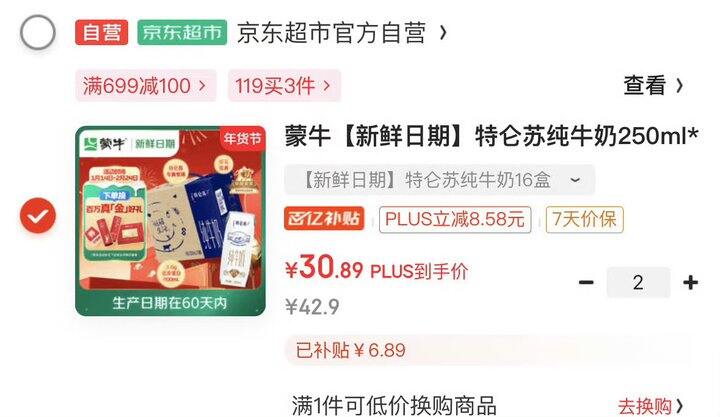 会场下拉领79-12劵https://u.jd.com/JDitLSR 【自营包邮】蒙牛特仑苏 纯牛奶250ml*16盒/提