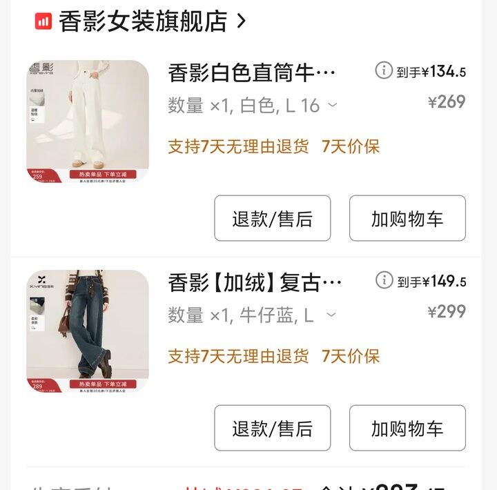 大力推荐香影的牛仔裤,这三条都是加绒的,本来我只是需要一条白裤子,没想到试了之后三条都想留,但是深刻纠结了一下,还是把蓝色那条退了,留了黑白两条。我属于屁股大胯宽那种,胯宽97,买裤子的唯一要求就是不显胖,这三条裤子都符合,而且质感确实不错