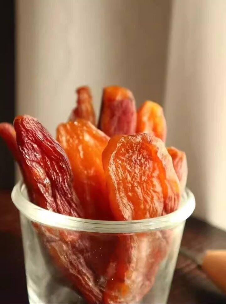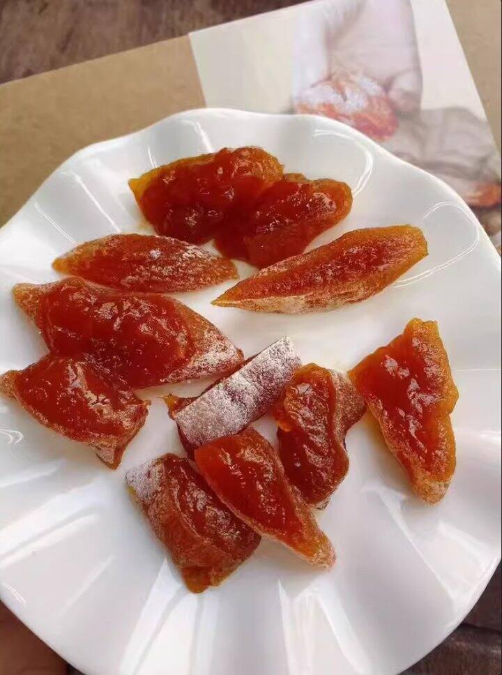 遵循着自然时令的美味, 它是深秋采摘的好柿子,到时间采摘下来后 将一颗颗去皮的果子悬挂上架,场地必须通风。自然晾晒。挂在架子上的柿果需要一个多月的晾晒。