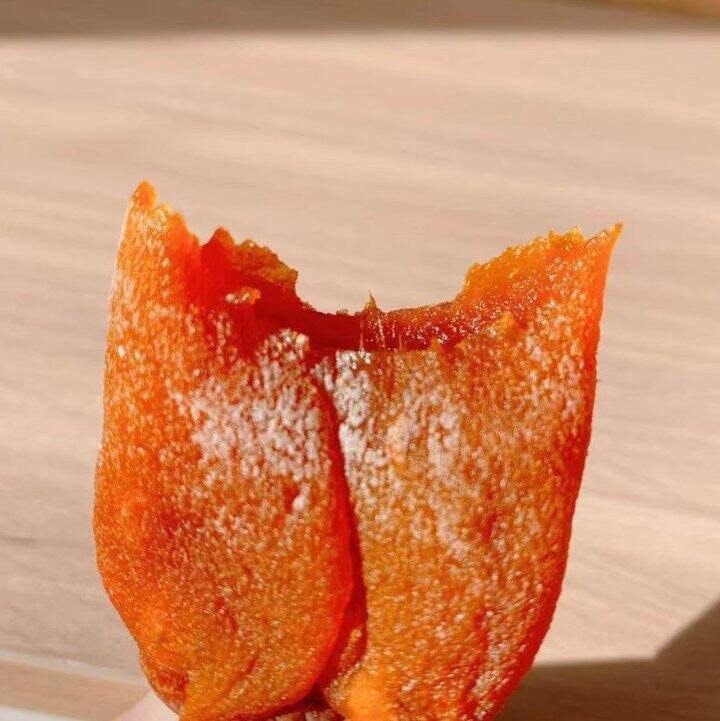 在历经了漫长的两个月的晾晒后,当柿果里的水分含量很低出现些许白霜,再进行捂霜。全程无添加!柿饼的干度合适后,才会有大家看到的柿饼!