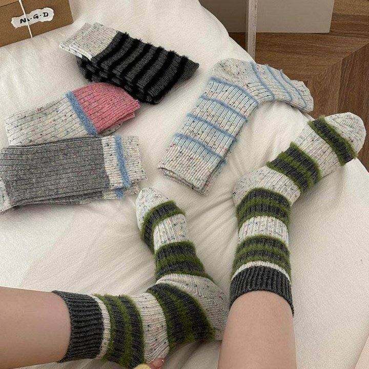 坚果妈咪毛绒条纹袜子女中筒秋冬加厚保暖点子纱拼色日系堆堆长袜