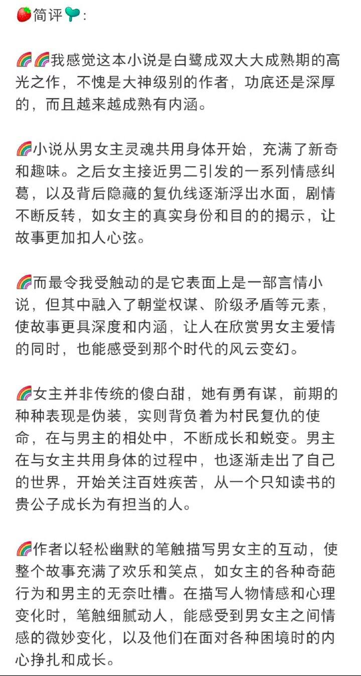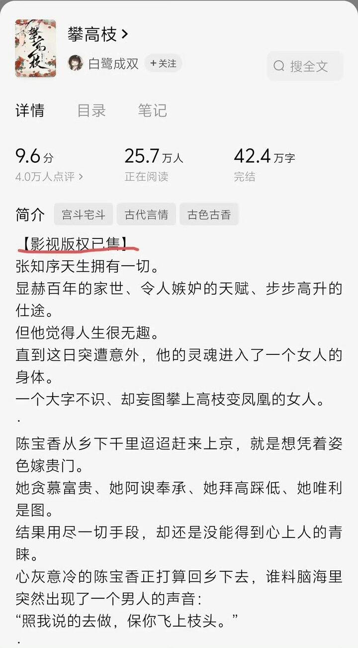 我这看文的速度越来越快了,爱看大女主的姐妹千万别被小说的名字和简介误导了,跟我一样真以为是女主攀高枝,后面的反转蛮精彩的,女主比男主刻画的更有个人魅力。